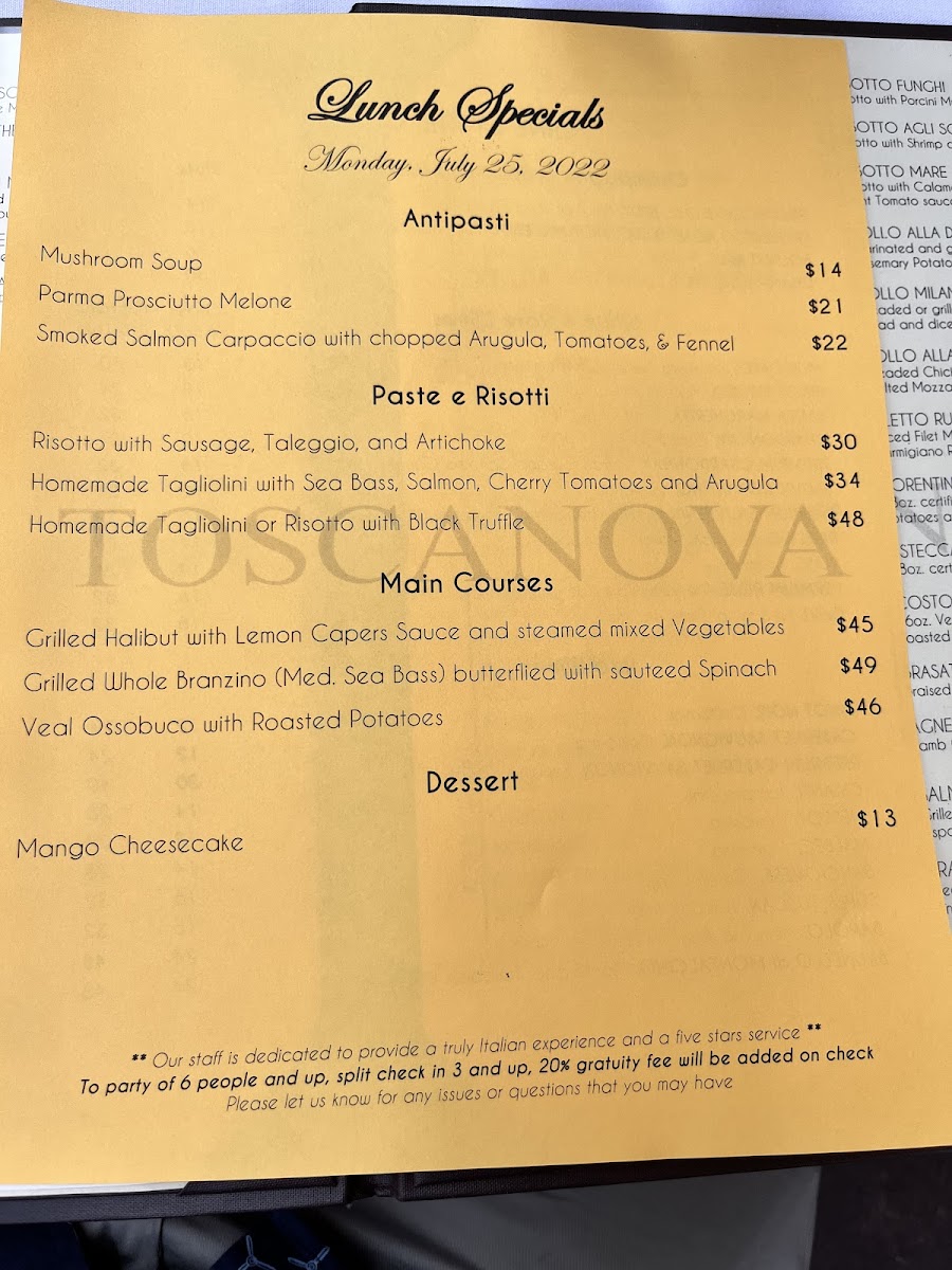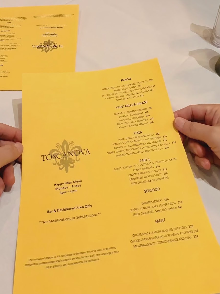 The dessert menu at Toscanova is equally enticing. The Tiramisu ($10) is a must-try - a luscious coffee-flavored delicacy that melts in your mouth, leaving you craving more. Pair it with their velvety Chocolate Souffle ($12) for a sweet finale that will satisfy any sweet tooth. With guests frequently raving about their culinary creations, it's clear that the kitchen takes pride in serving dishes that are both satisfying and memorable.